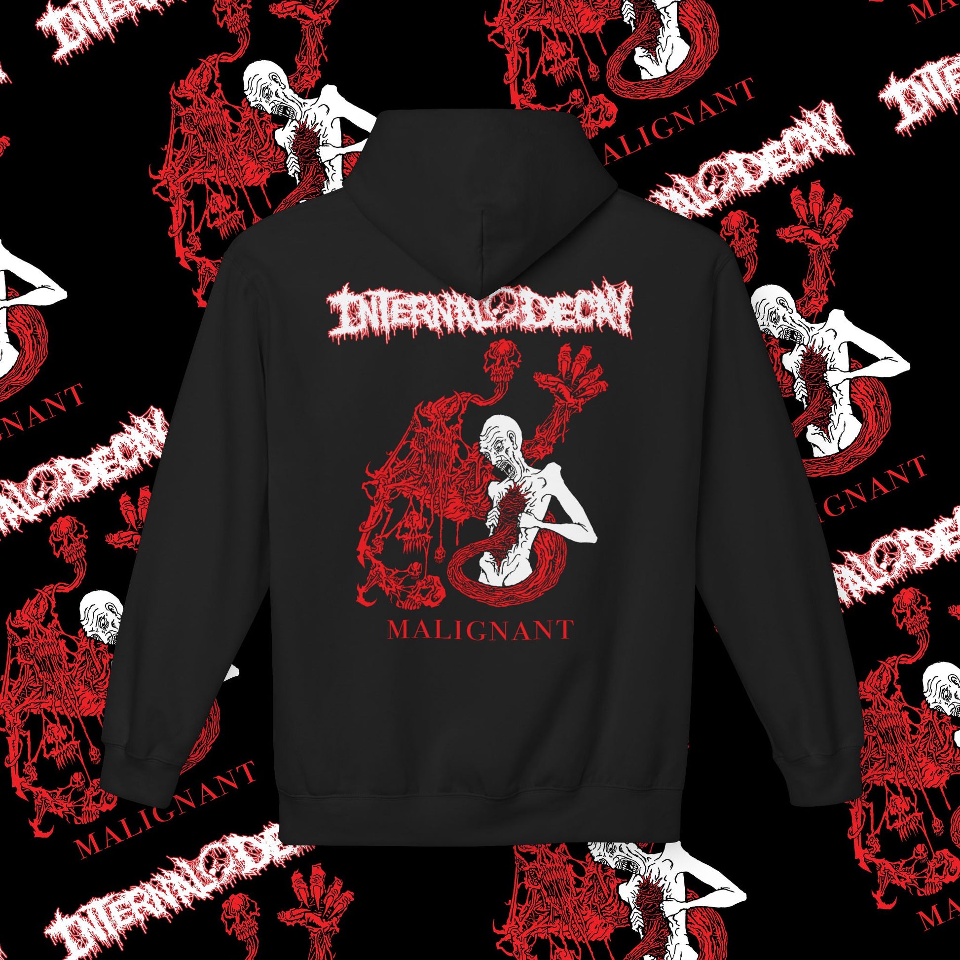 Pullover hoodie with white and red logo on the front and the 'Malignant' art on the back.